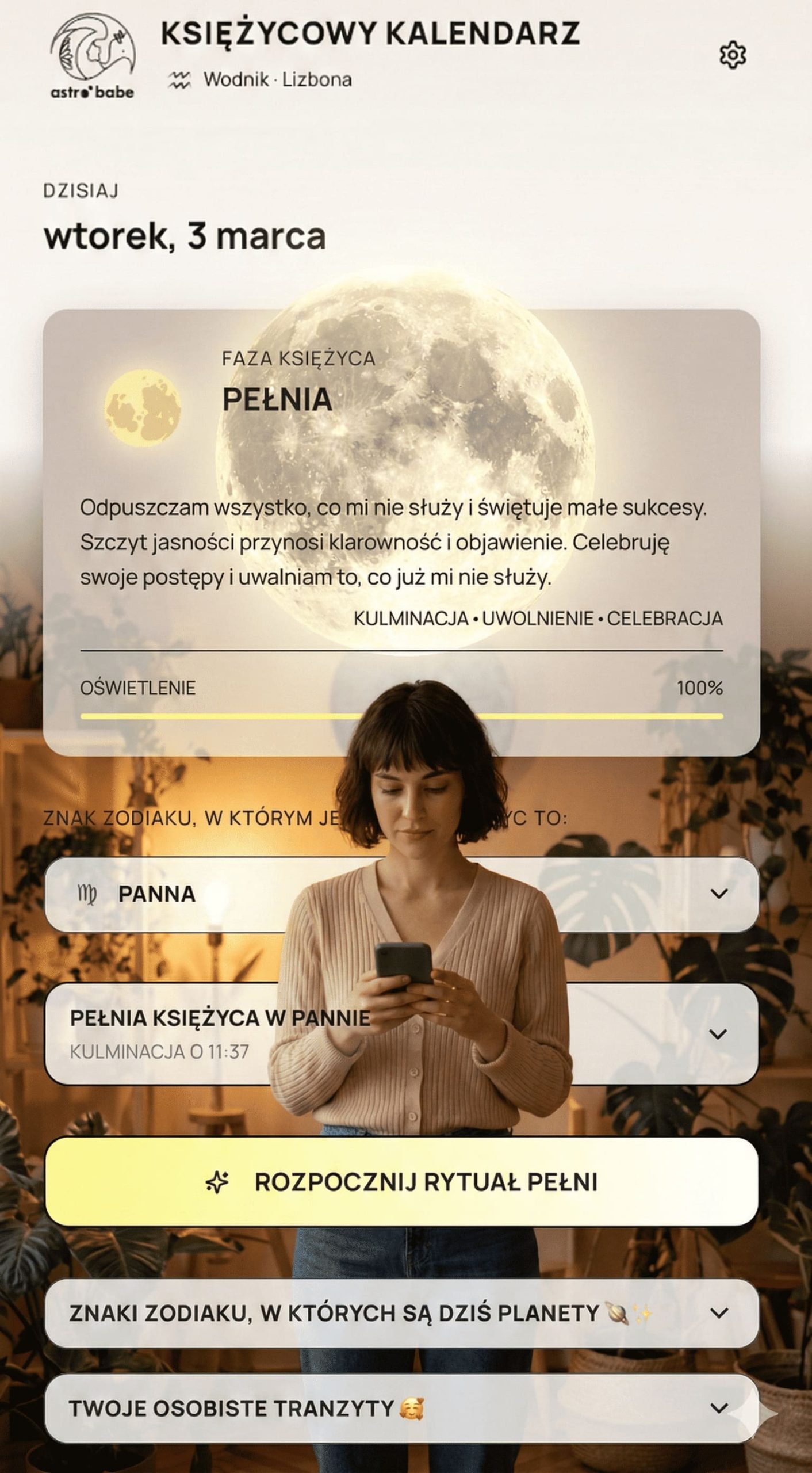 3. Codzienna nawigacja lunarna System 24-godzinny oczekuje od nas tego samego, stałego poziomu energii każdego dnia, ale my żyjemy z Ziemią i jej cyklami. Aplikacja na bieżąco pokazuje Ci, w jakiej fazie i w jakim znaku zodiaku znajduje się w tej chwili Księżyc. Dzięki temu możesz w każdej chwili sprawdzić aurę dnia, połączyć kropki ze swoimi nastrojami i łagodniej dobierać codzienne działania do naturalnego rytmu.