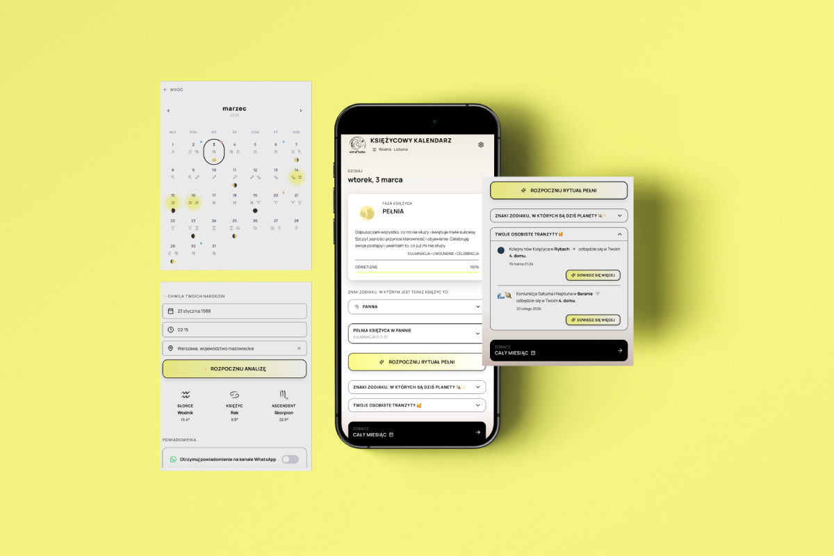 Twój osobisty przewodnik po kosmosie. To znacznie więcej niż kalendarz lunarny – to Twoja cyfrowa przestrzeń do pracy z energią. Aplikacja nie tylko prowadzi Cię przez fazy Księżyca, ale generuje Twój interaktywny, osobisty kosmogram (na razie mamy Słońce, Księżyc i ascendent, ale będzie więcej!). Ponadto śledzi Twoje osobiste tranzyty (w którym Twoim domu będzie najbliższy nów, w którym domu jest obecna koniunkcja Saturna i Neptuna… morę coming soon) i informuje o ważnych zmianach na niebie (ingresach), pomagając Ci wykorzystać kosmiczne cykle do wyjścia ze schematów i świadomego kreowania swojego życia na własnych zasadach. Co ważne, aplikacja pokazuje dokładnie, kiedy Księżyc wchodzi w Twój słoneczny znak zodiaku, co jest kluczowe, jeśli śledzisz swój cykl sacred secretion.